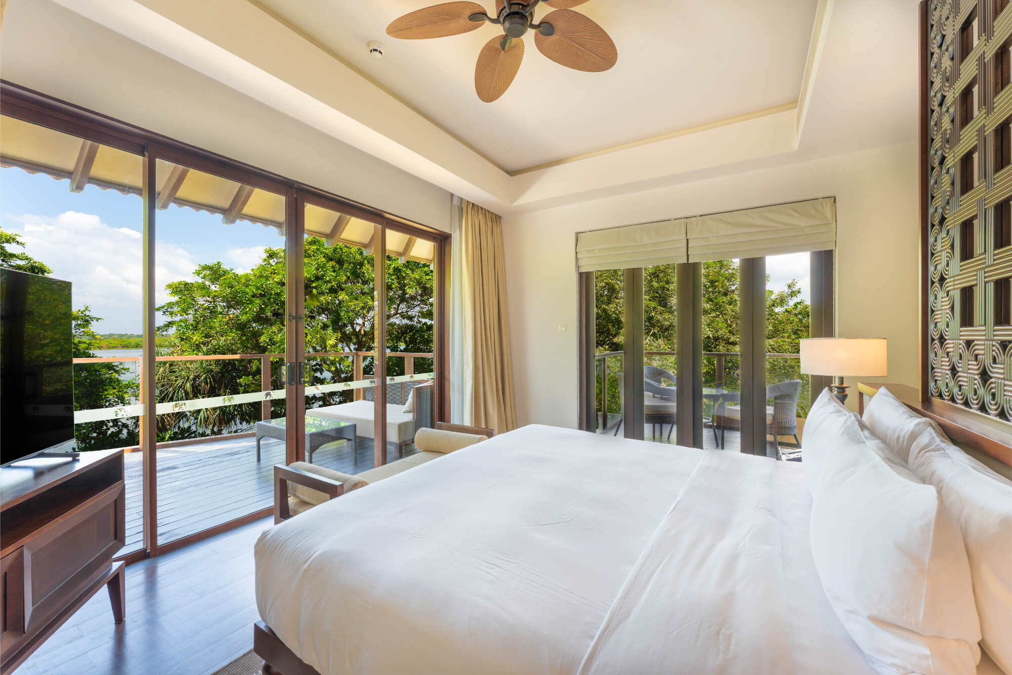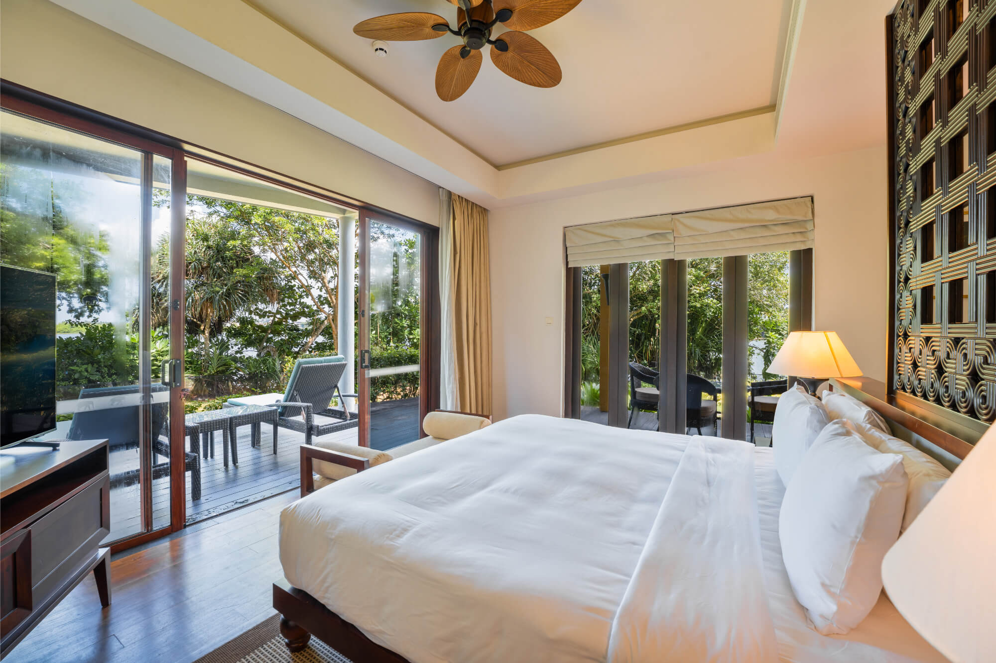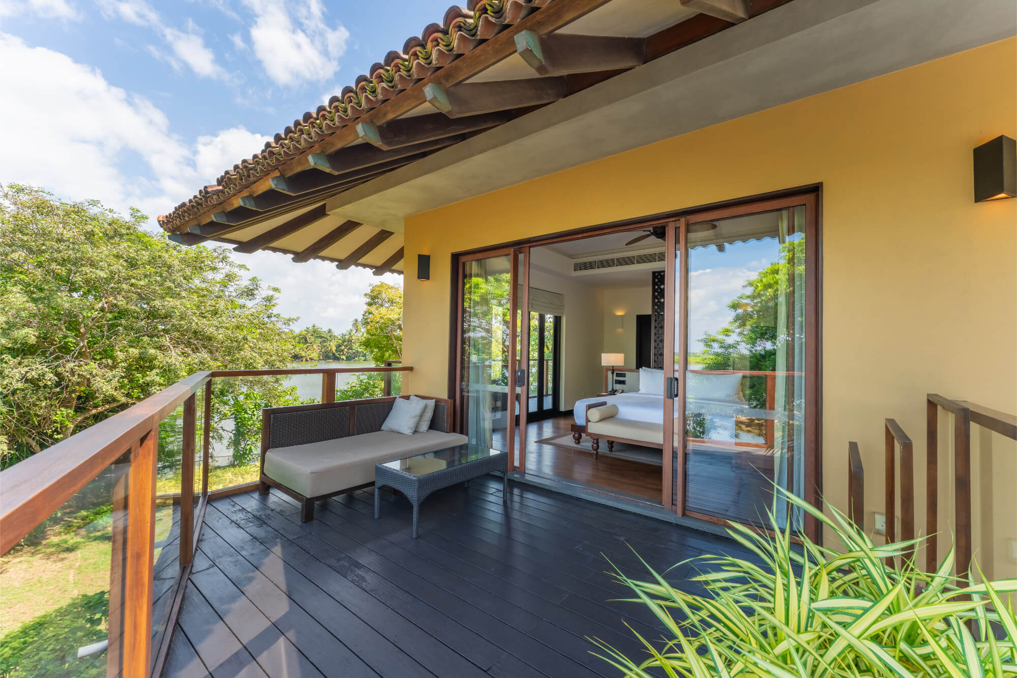 Peaceful lagoon-facing rooms with balcony or terrace and calming water views.