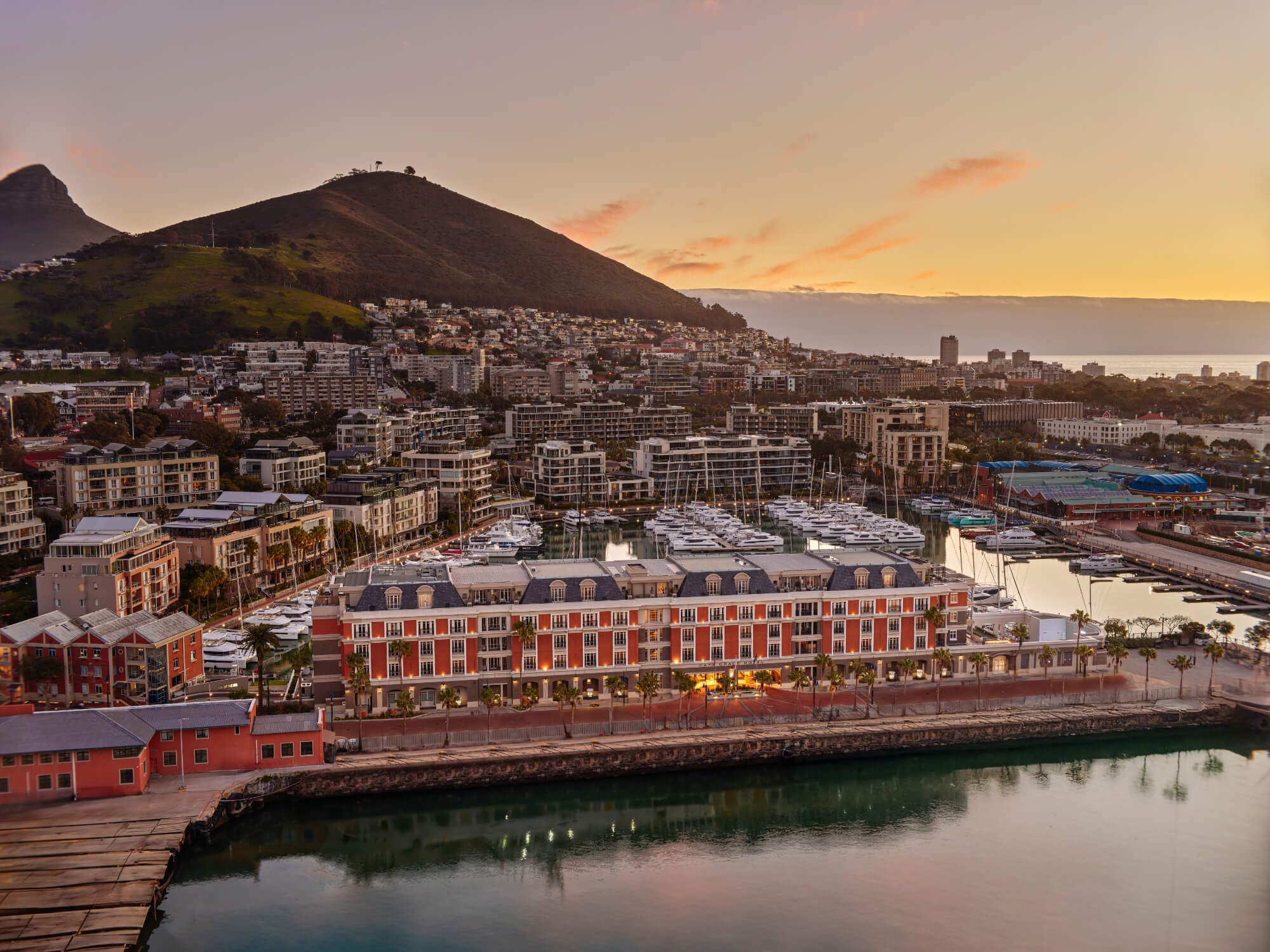 Rooftop relaxation lounge with panoramic views of Table Mountain and the marina