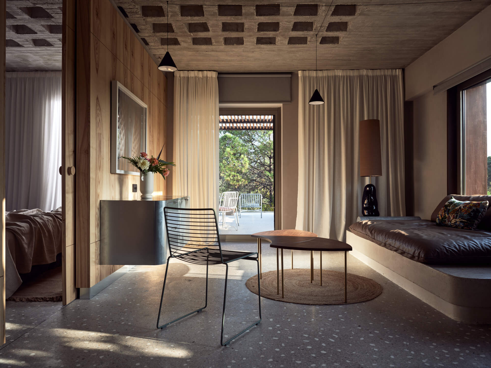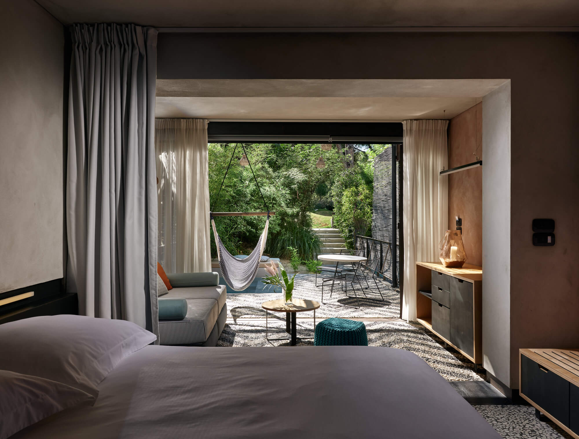 Junior Suite with Patio – 27–32 m²; furnished patio and soothing natural tones.