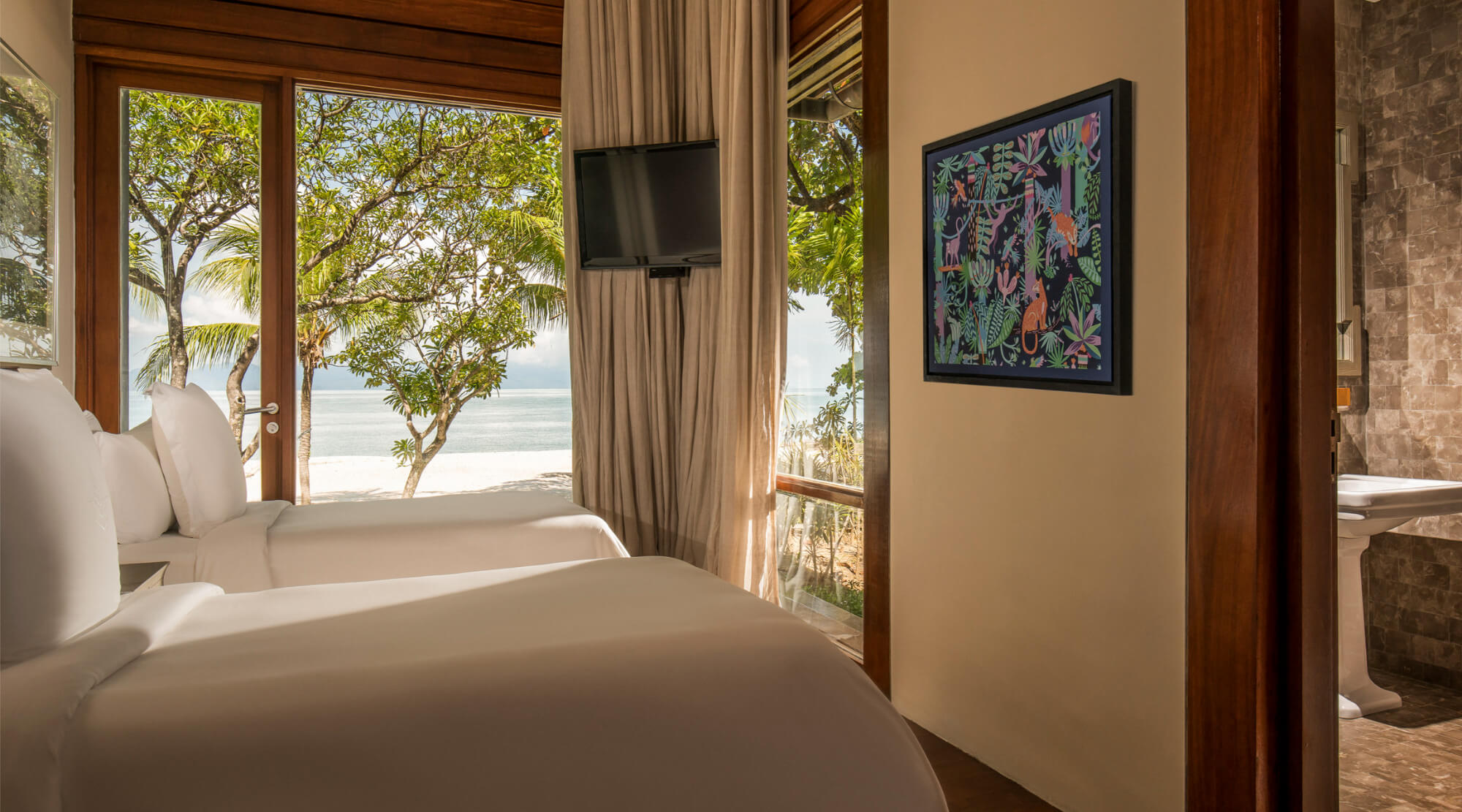 A spacious beachfront villa with 226 m² of indoor–outdoor living space, two en-suite bedrooms, living and dining areas, and a private plunge pool just steps from the beach. Sleeps up to 4 adults or 3 adults and 2 children.