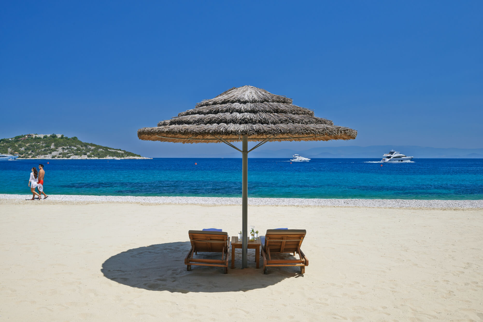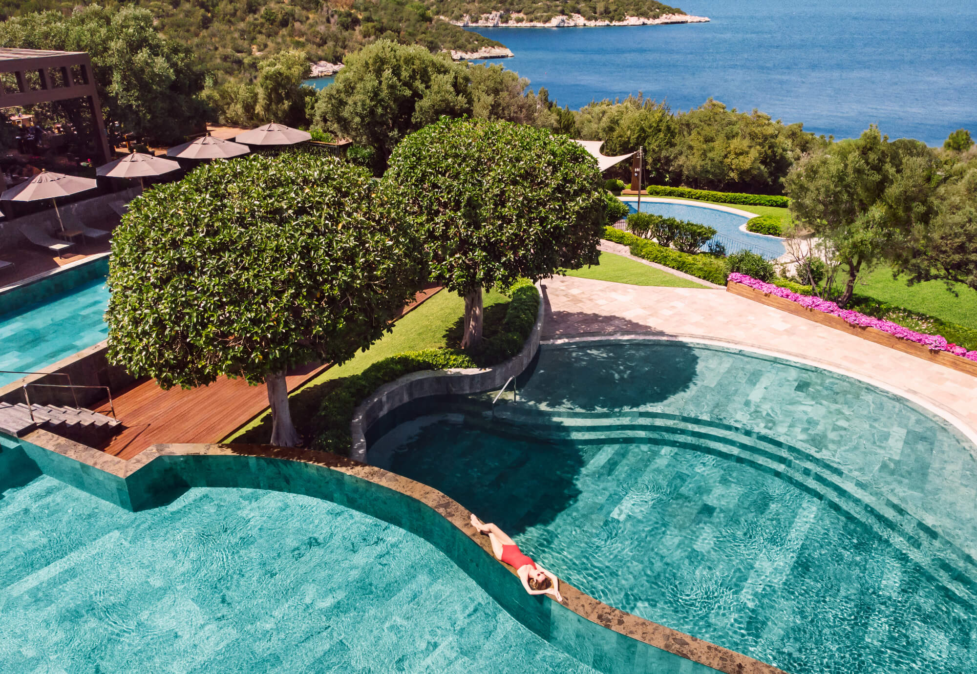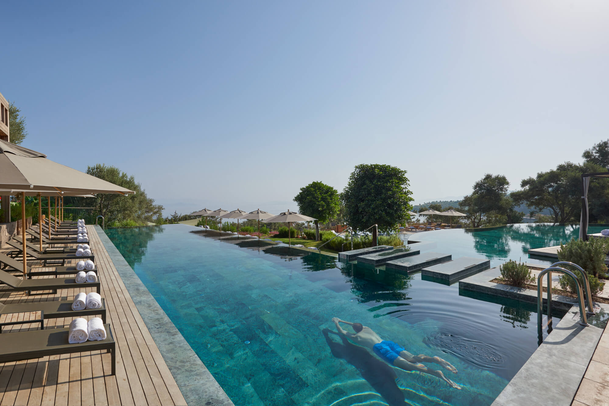 Designed by Antonio Citterio, Patricia Viel & Partners, the interiors blend natural marble, warm teak, woven textures, and panoramic glass — creating a calm, contemporary Aegean aesthetic. With private pools, lush gardens, exceptional dining, a vast wellness centre, and thoughtful family facilities, this is a place where days unfold slowly and beautifully.