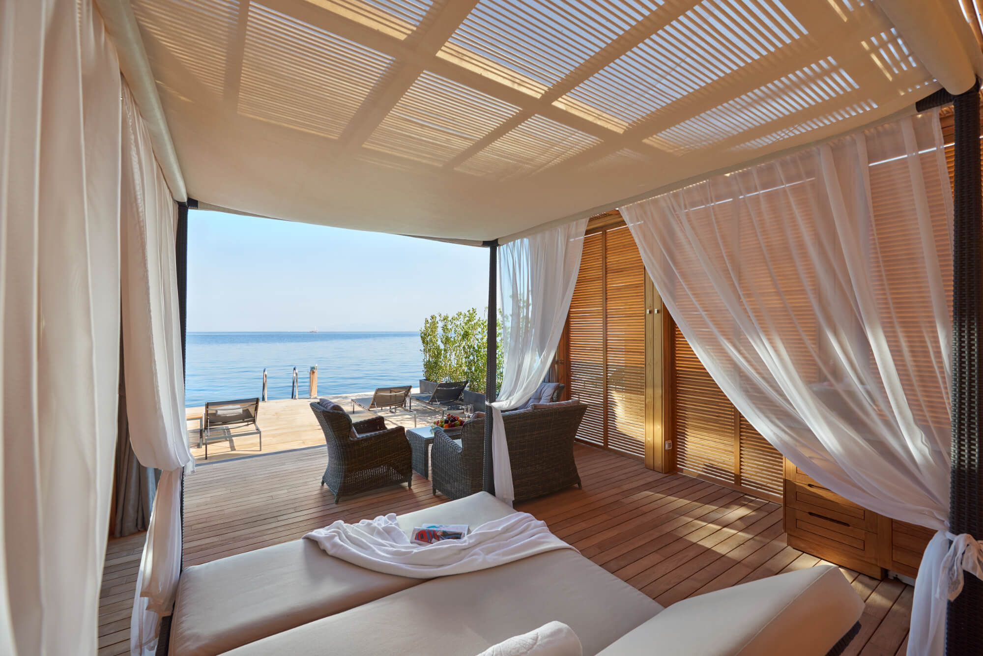 A two-bedroom hideaway surrounded by gardens and bay views, featuring a private hammam and sauna, wraparound balcony, and generous living areas — ideal for families who want space and privacy.
