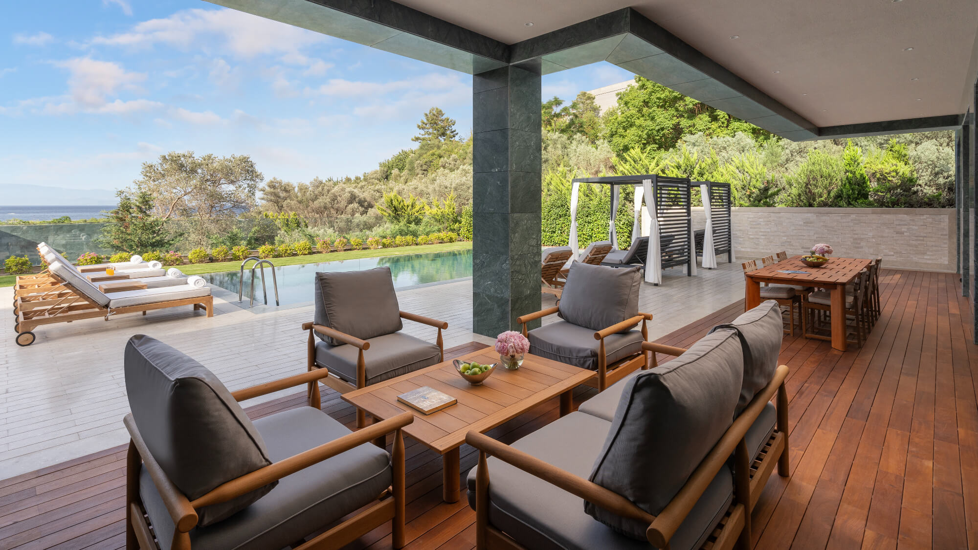 Freestanding master suite, indoor/outdoor dining areas, private pool and large sea-view terrace.