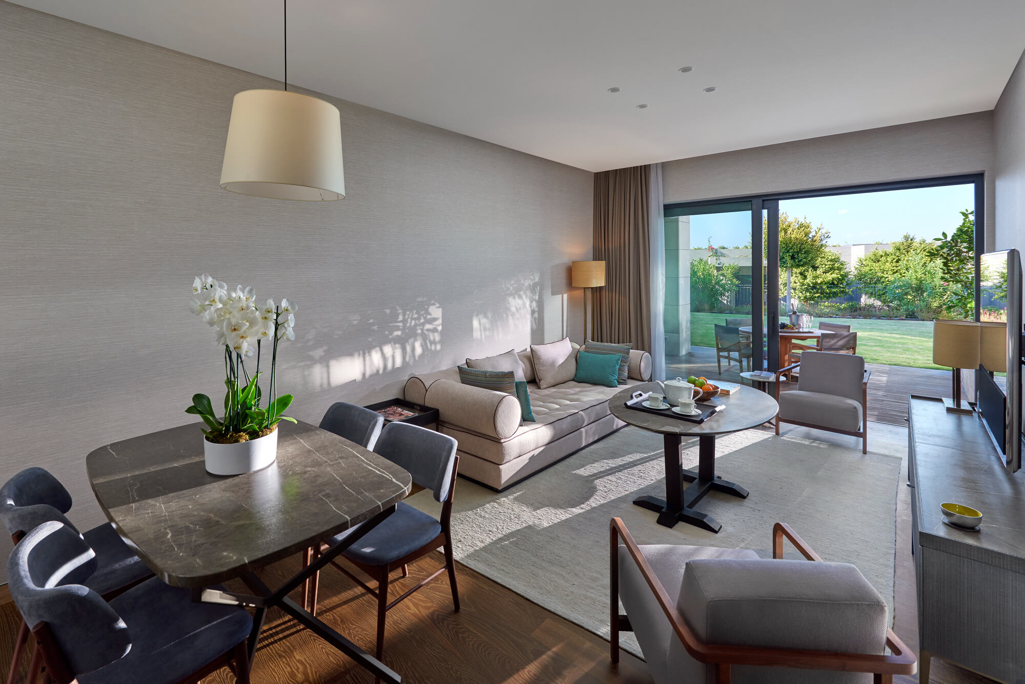A tranquil space surrounded by greenery, featuring a king or twin bed, daybed, large marble bathroom, dressing room, and a terrace with dining area. Ideal for couples with a baby.