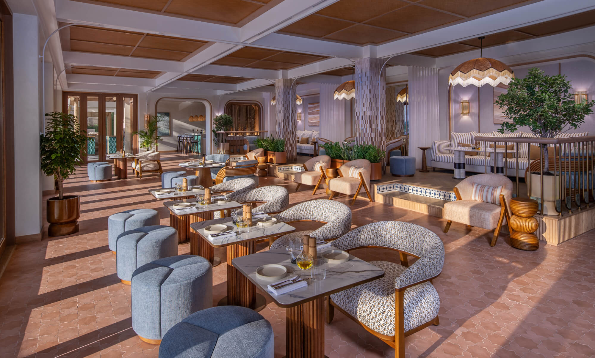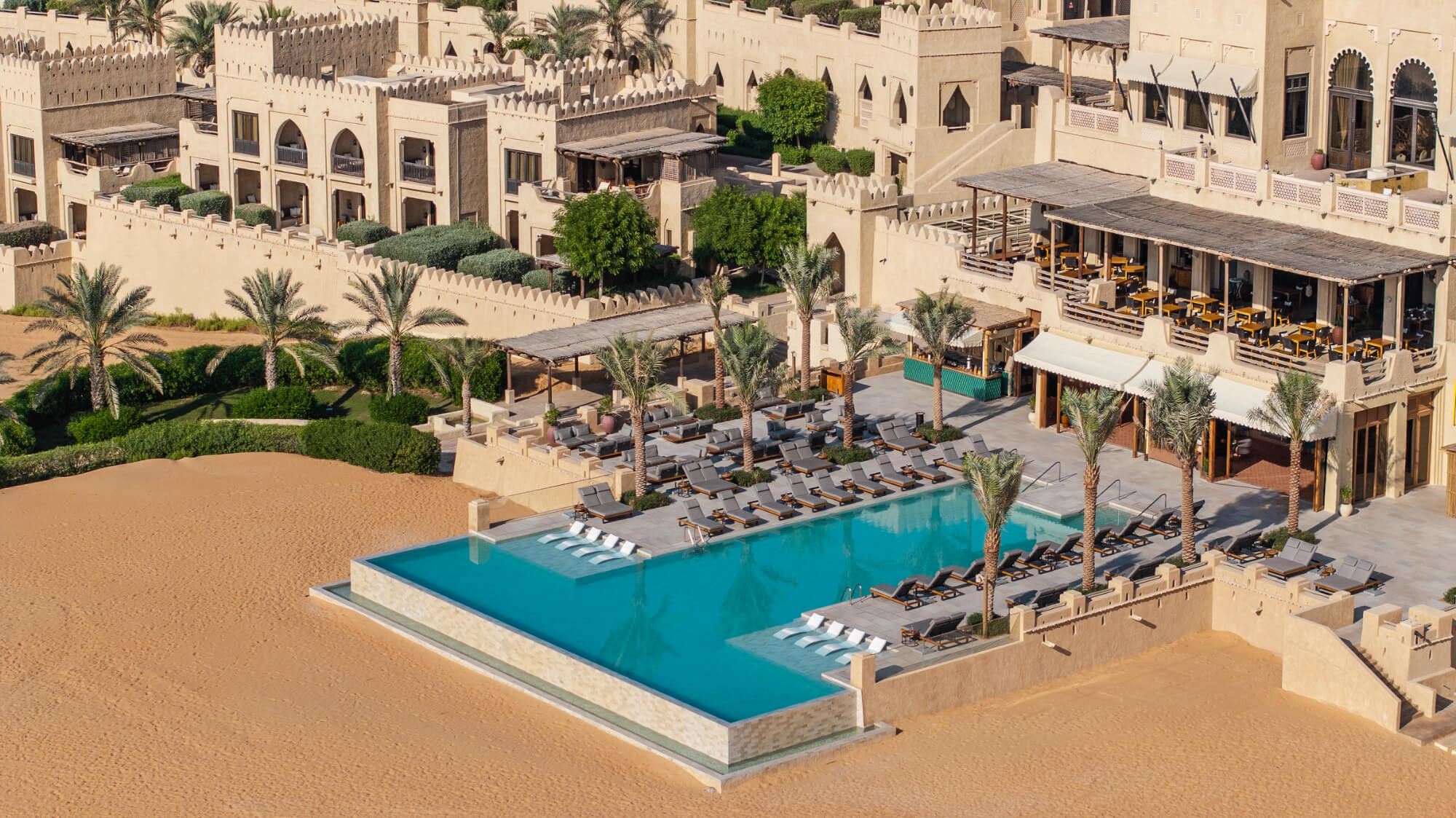 Ghadeer – Poolside dining by day, transforming into a relaxed evening restaurant serving international dishes.