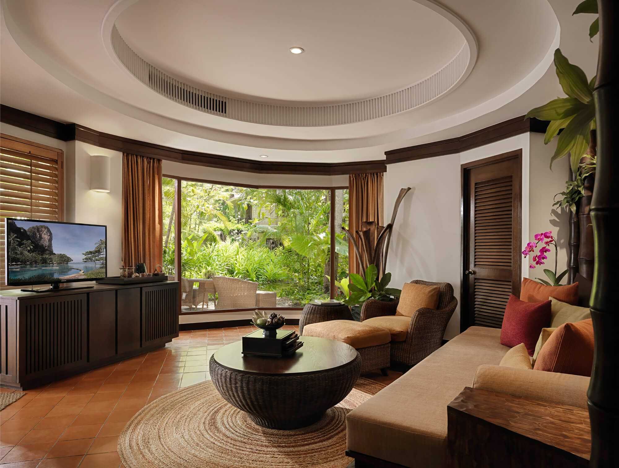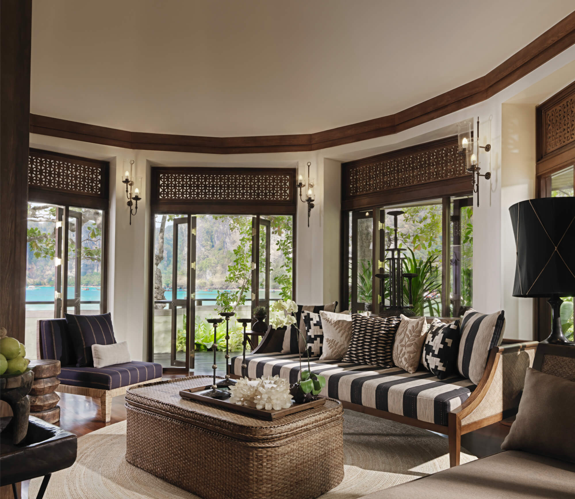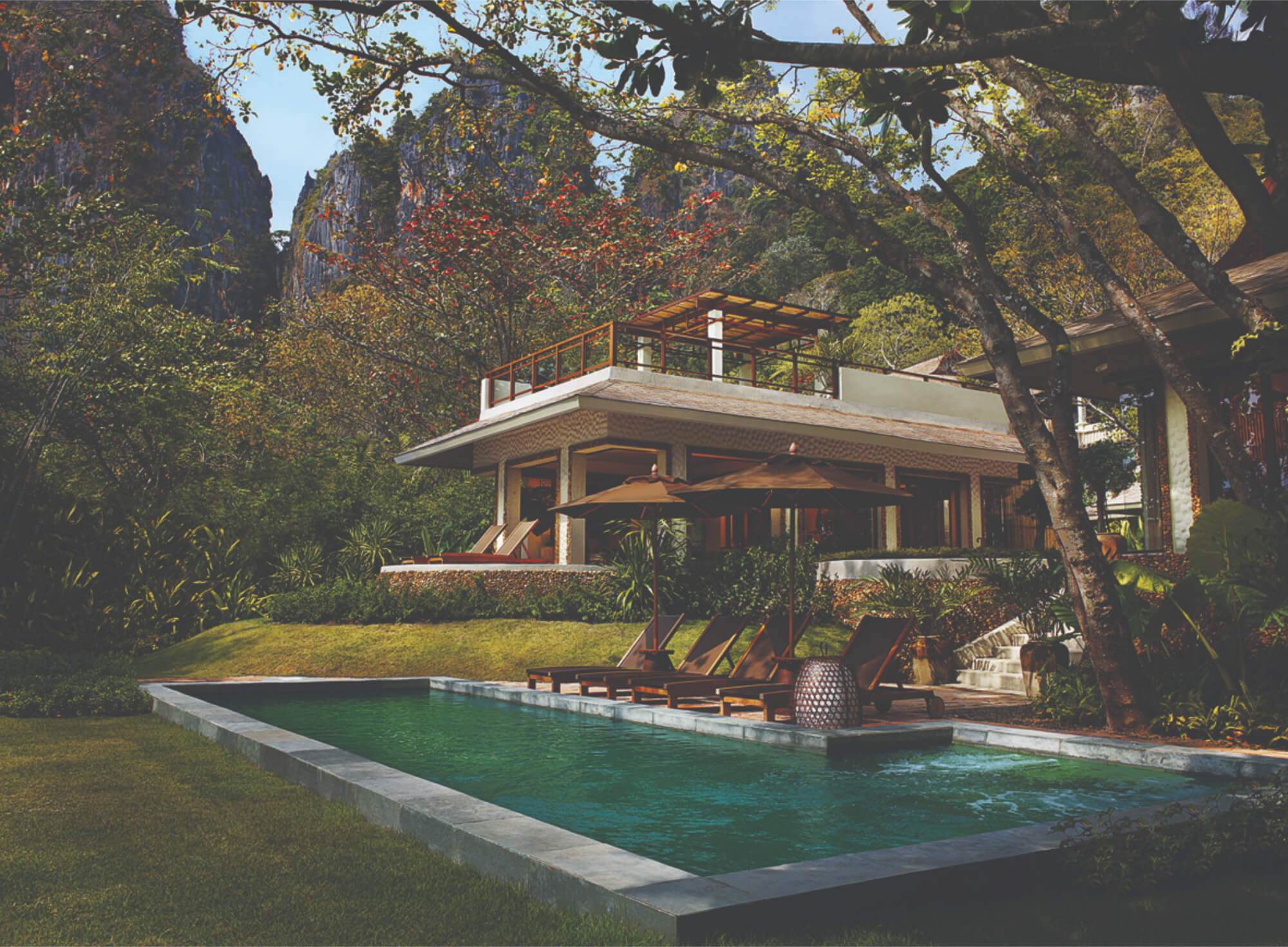 Discreet three-bedroom villas tucked among dramatic cliffs with views over Phranang Beach, featuring a private pool, master bedroom with en-suite bath, two additional en-suite guest rooms, living and dining areas, kitchenette, and dedicated butler service.