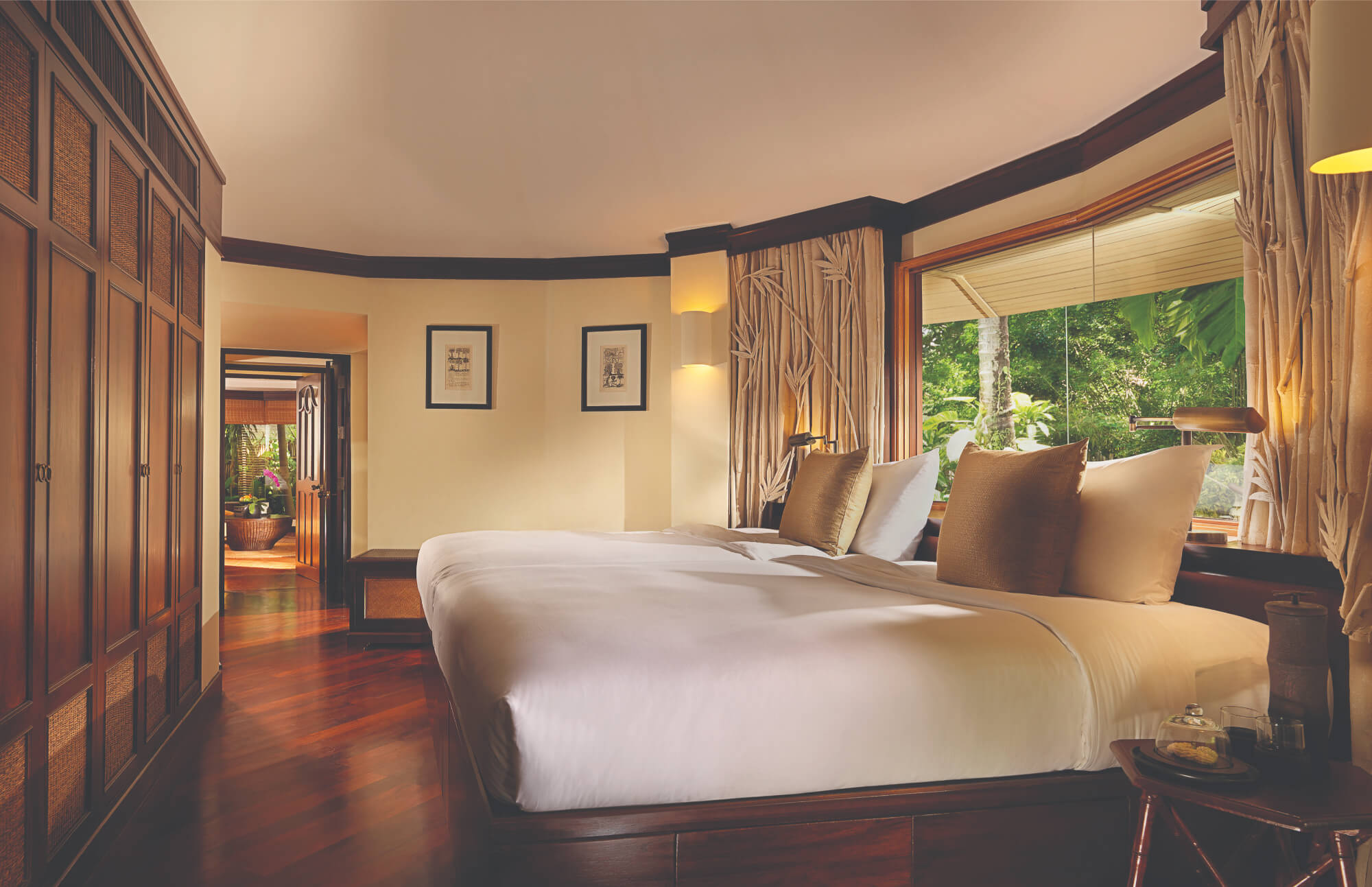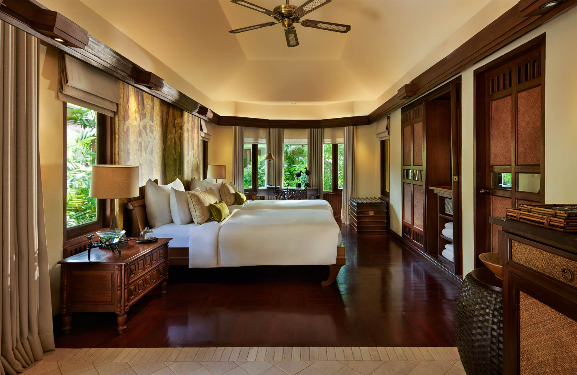 Two-bedroom pavilions with a 3 x 8 m freshwater private pool in an enclosed tropical garden, with sun loungers and a dining area for relaxed family time.