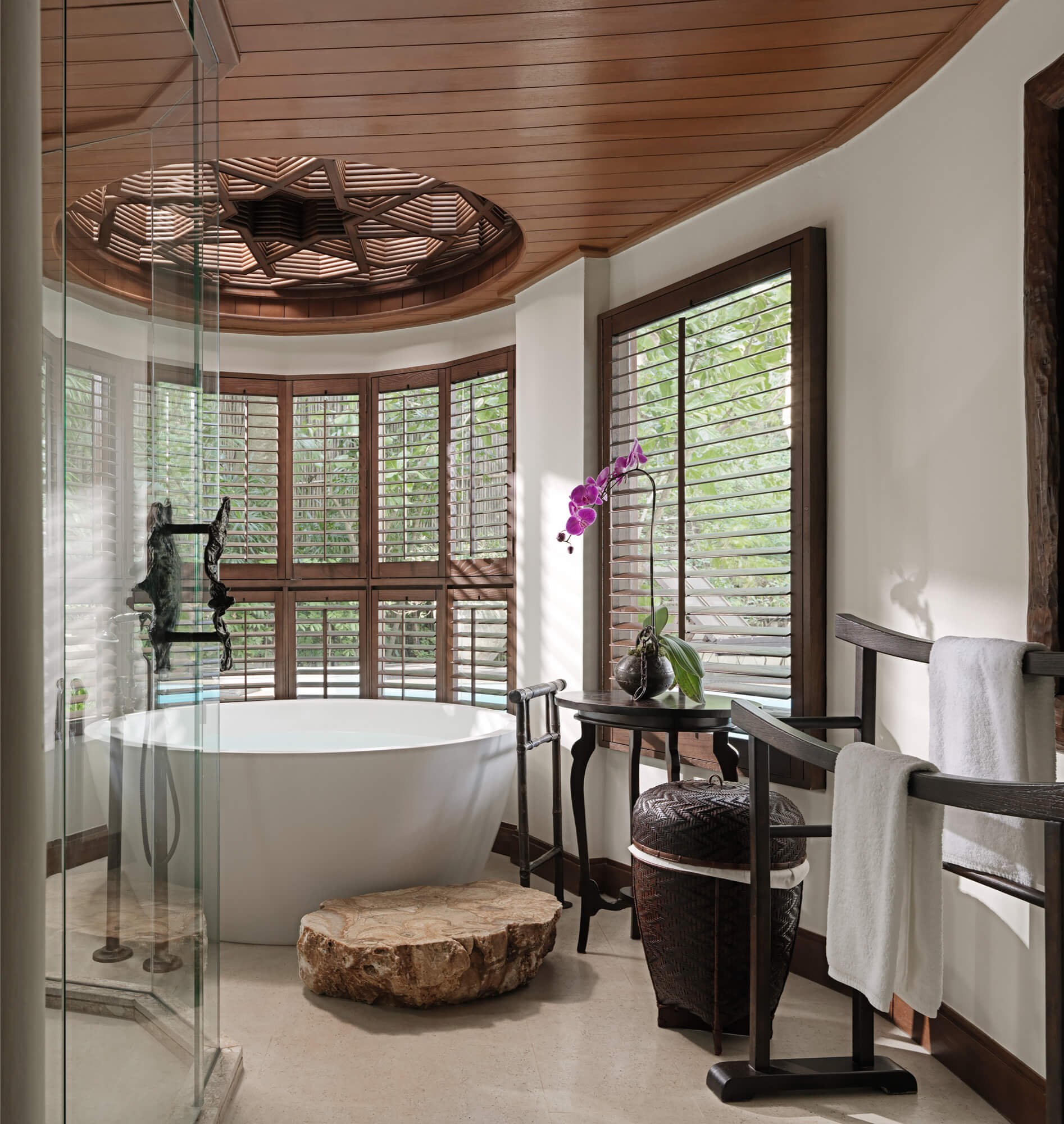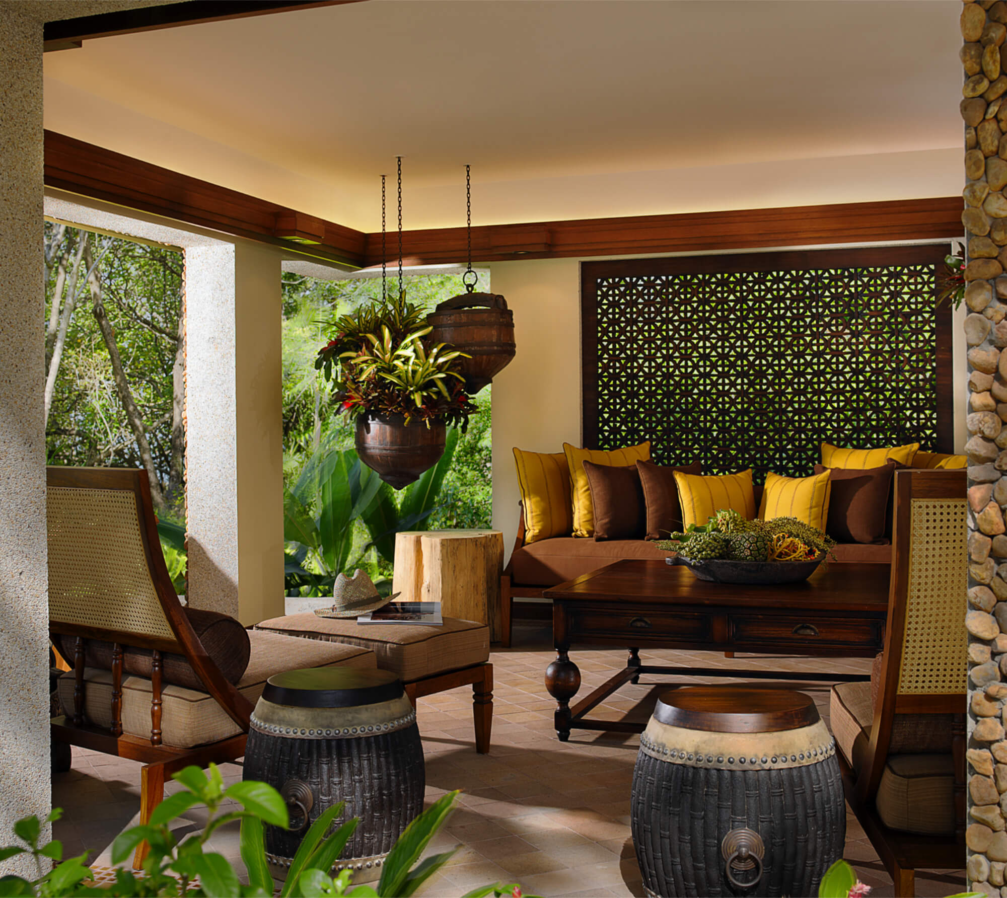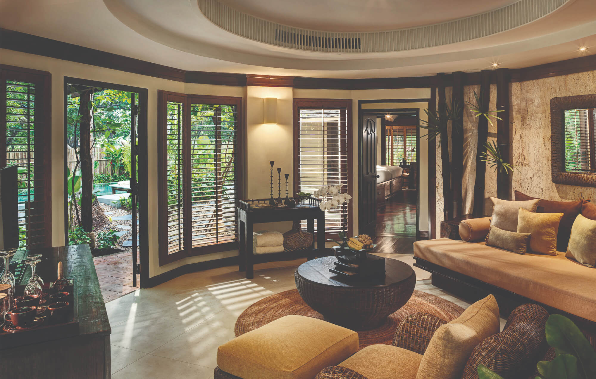 Two-storey pavilions with fully equipped, spacious interiors and tropical décor – polished wood, rich fabrics, handcrafted details, plus an outdoor terrace with seating.