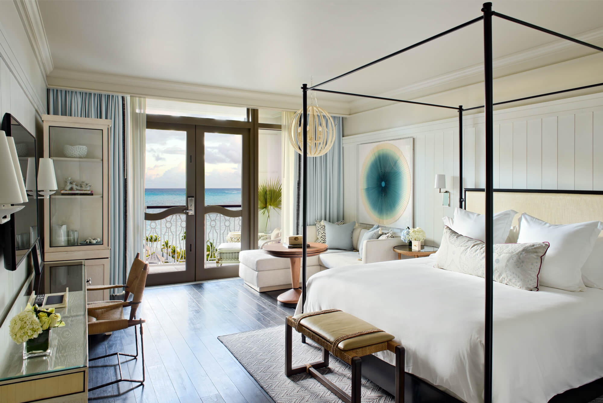Premier Ocean View Grand Three-Bedroom Suite (2,668 sq ft) – A large lounge, expansive dining room and full kitchen, with a primary bedroom and connecting studio suite (both with king beds).