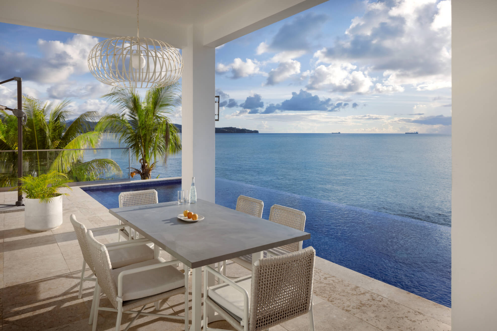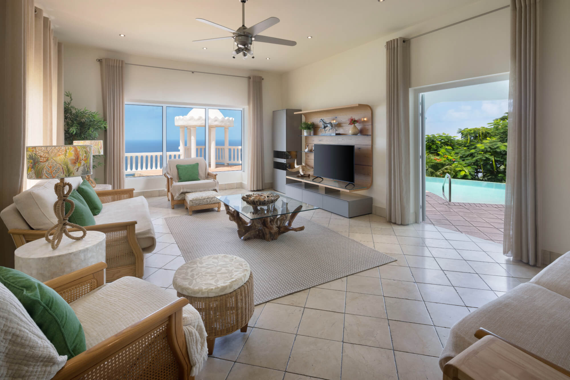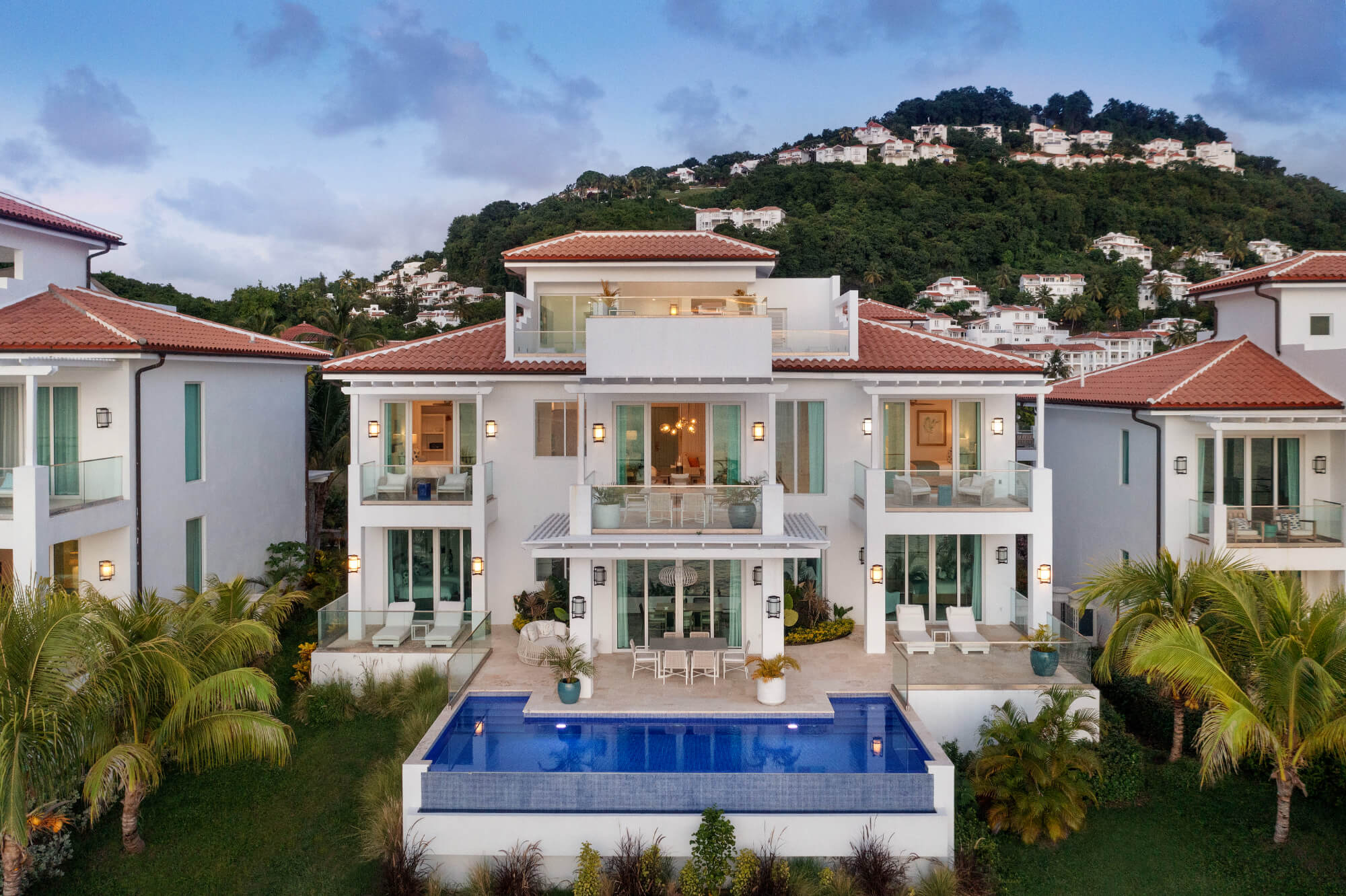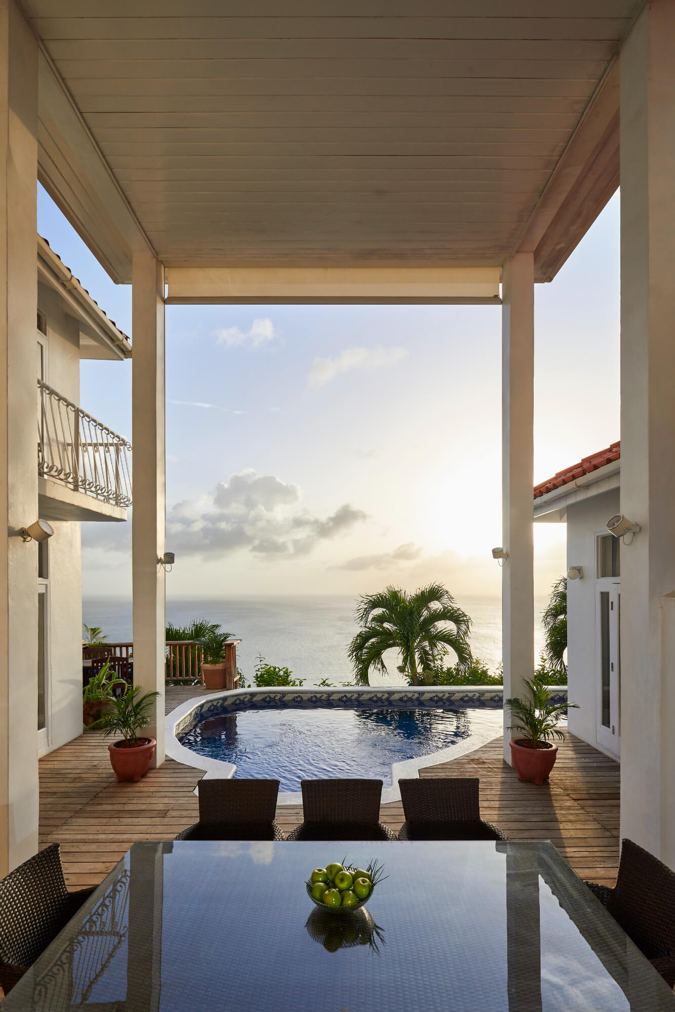 A dramatic private estate designed for milestones and multi-family escapes, with sweeping Piton and ocean views, multiple living spaces, extensive terraces and a private pool.